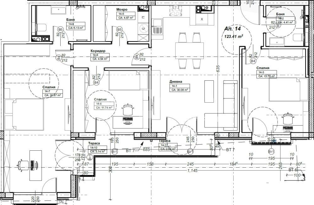 Многостаен апаратемент находящ се в един от най-атрактивните квартали на София - Оборище. Състои се от: дневна с кухненски бокс, три спални, едната от които с площ от 25кв.м. две бани, мокро помещение и тераса.