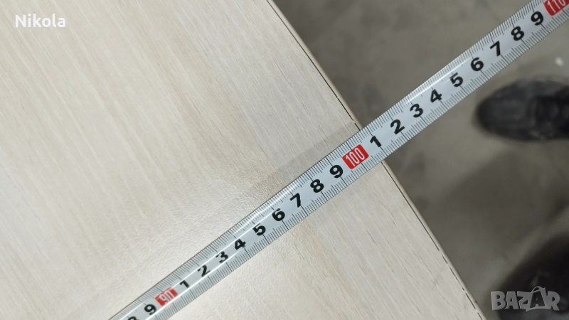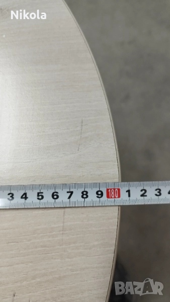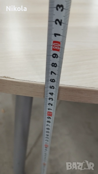Продавам здрава солидна офис маса с метални крака в добро състояние. Размерите му са ширина 100см, дължина 180см и височина 75см с нивелиращи се крака. Масата е здрава с дебелина на плота 2,5см и централен отвор за комуникация. Цвета е светъл избелен дъб. Като забележки има малки драскотини в единия край.