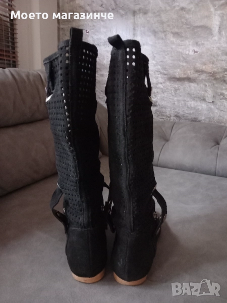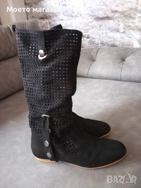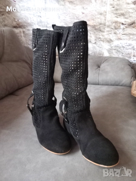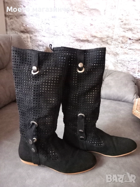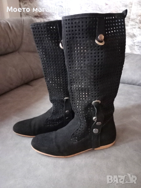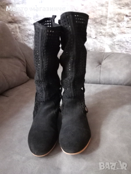 Ботуши от естествен велур с интересна перфорация и декоративни метални елементи. Леки, удобни и дишащи – чудесен избор за пролет и есен. Стоят прекрасно с рокля, пола или дънки. Носени са броени пъти, в отлично състояние.