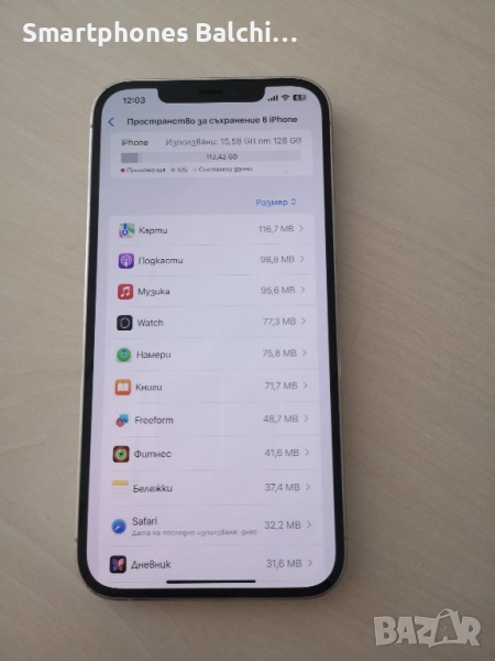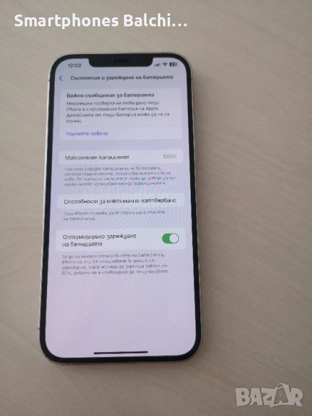 Smartphones Balchik Продава в отлично технически и визуално състояние Iphone 12 Pro Max Silver-128гб. Отключен към всички Оператори. Face ID работи, и е с чисто нова батерия на 100% живот. Всичко работи отлично. Готов за ползване.За повече информация, заповядайте в магазина на ул. "Черно Море "до банка ДСК.