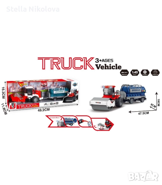 Комплект фадрома и ремарке за игра. С гумени колела, инерционен механизъм, подвижни части, звук и светлина. Подходящо за момчета над 3 години.