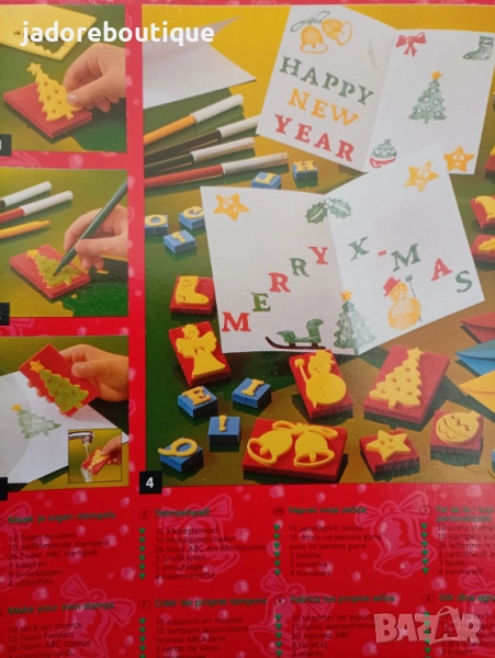 Комплектът съдържа 3 бели заготовки за картички, 3 цветни плика, 4 броя флумастери различни цветове, блокчета от EVА хартия (фоам), латинската азбука и 10 броя коледни фигурки за печатите. Азбуката и коледните фигурки са самозалепващи се, за да може бързо и лесно да ги прикрепите към блокчетата.
