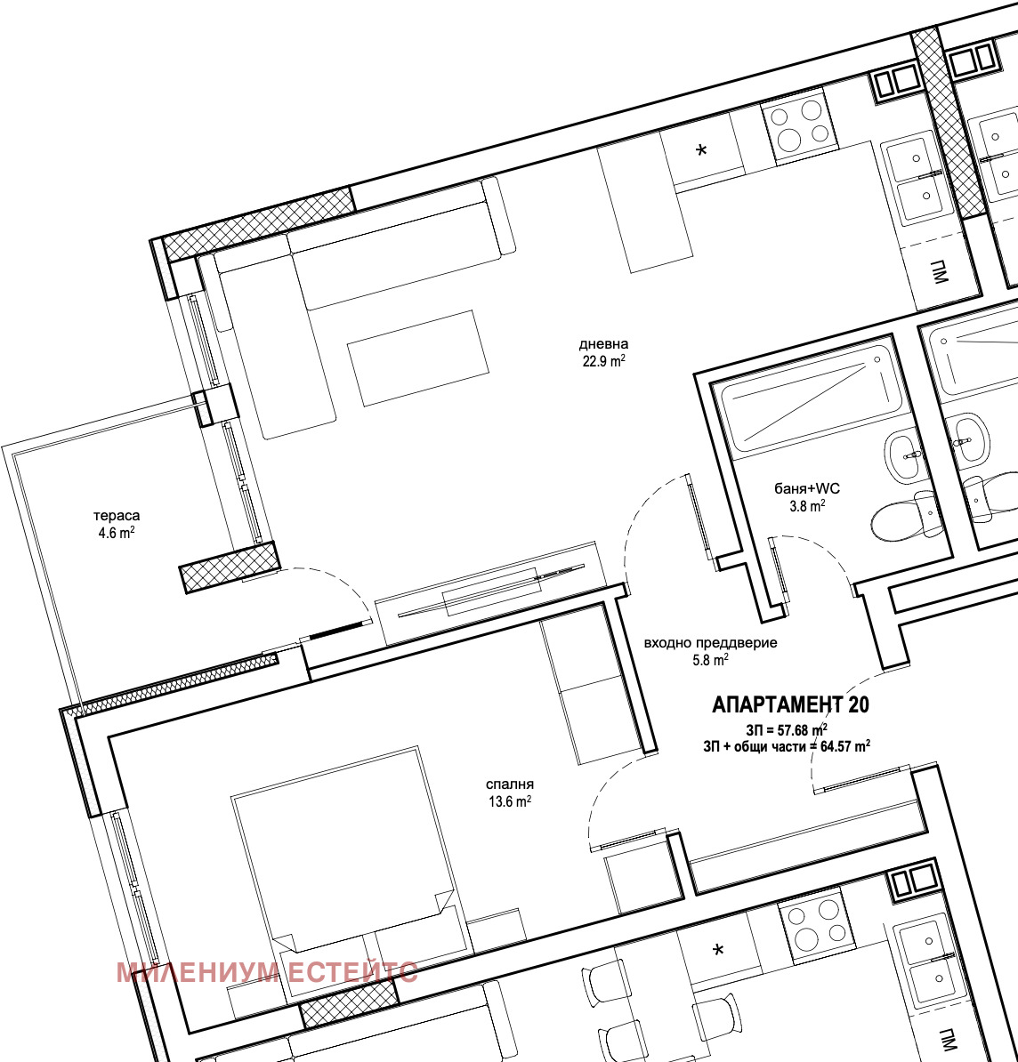 Разпределение: входно антре, всекидневна с кухненски бокс, спалня, баня с тоалетна и тераса.
