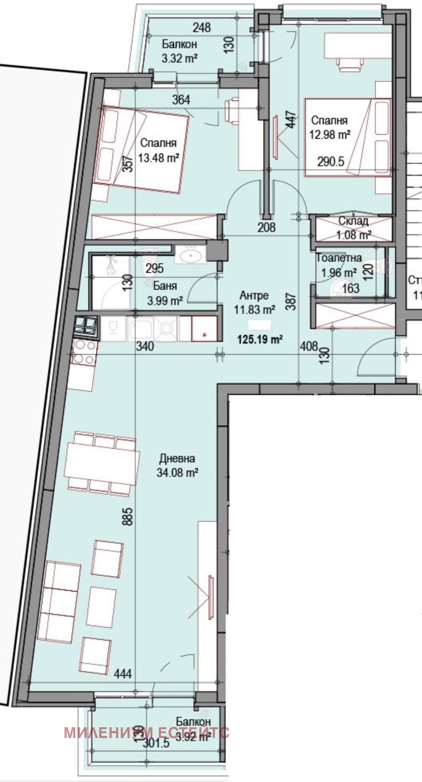 Разпределение: входно антре, всекидневна с кухненски бокс, 2 спални, склад, баня с тоалетна, тоалетна и балкон.