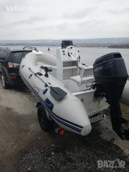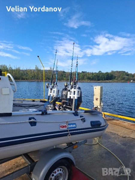 Продавам лодката от снимките, без допълнителното оборудване като сонае, двигател и колесар, столове. Има централна конзола, гребла, 2 стойки единични стойки за въдици, 2 тройни. Покривало на Zander 600D. Балоните са в перфектно състояние. Транецът и алуминиевото дъно са малко деформирани но не създсват проблеми. Има 1 см пукнатина в корпуса, която е залепена и не пропуска. Намира се във Варнани може да се пробва на вода.