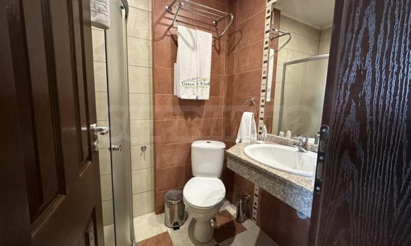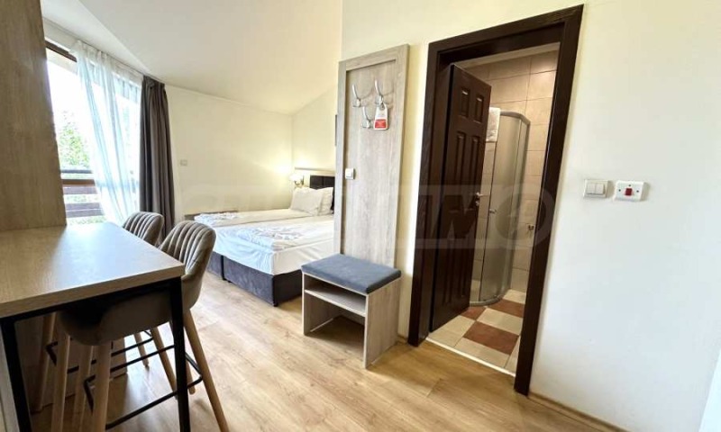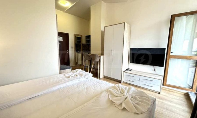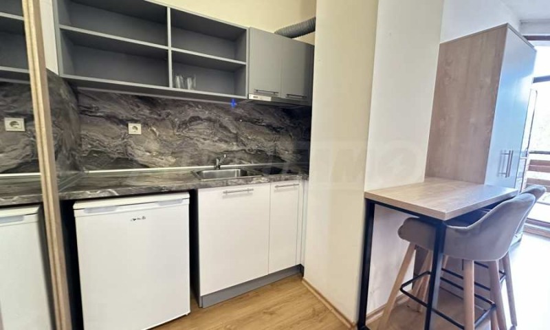 Апартаментът е тип студио и разполага със спалня, гардероб, барплот, напълно оборудвана кухня с 2 котлони, хладилник, тераса, баня с душ кабина и тоалетна.
