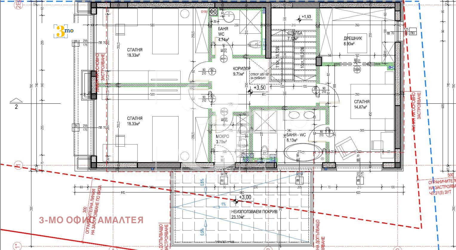 2-ри етаж - коридор (9,79 кв.м.), две спални от (18,33 кв.м.), родителска спалня (14,87 кв.м.) с баня с тоалетна (8,13 кв.м), отделна баня с тоалетна (4,74 кв.м.), мокро помещение (3,79 кв.м.) и дрешник (8,90 кв.м.). Къщата разполага с гараж (20,58 кв.м.).