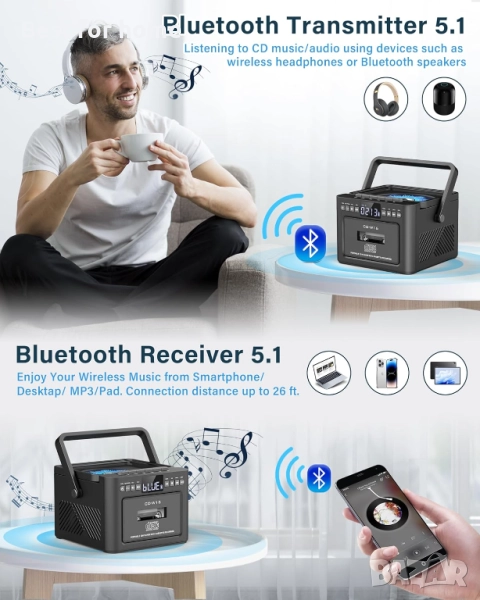 касетофон CD плейър Bluetooth 5.1 с батерия 5000mAh, 5W двойни стерео високоговорители, акумулаторен CD плейър с FM радио, дистанционно управление, запис на касета, 3.5 мм жак за слушалки, AUX/Micro SD/USB за дома