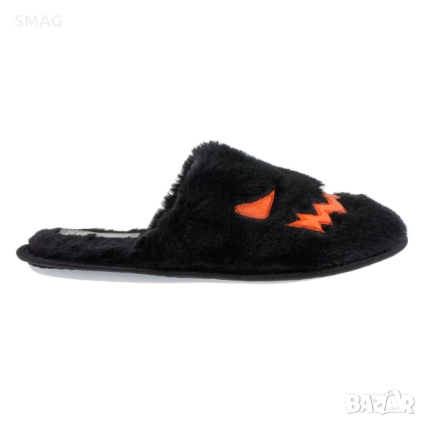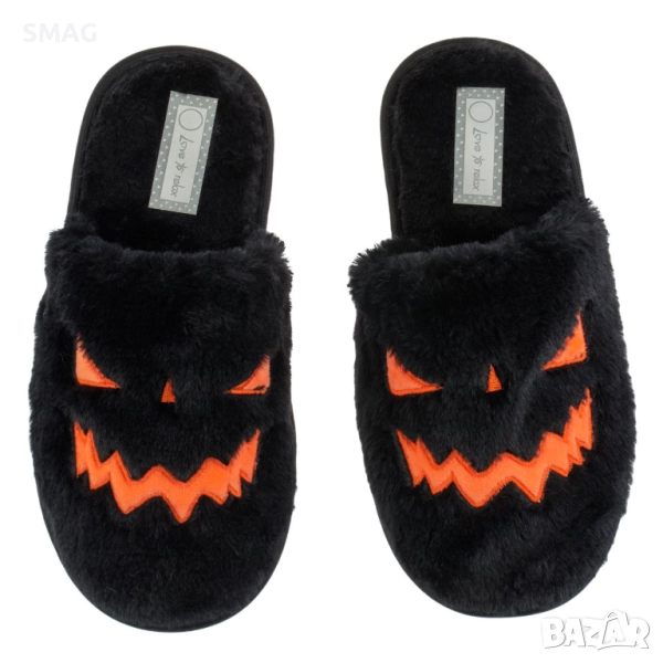 Меки и удобни Halloween / Хелоуин пантофи в черен цвят с ярко оранжево тиквено лице. Идеални за уютни и забавни визии у дома по време на празника.