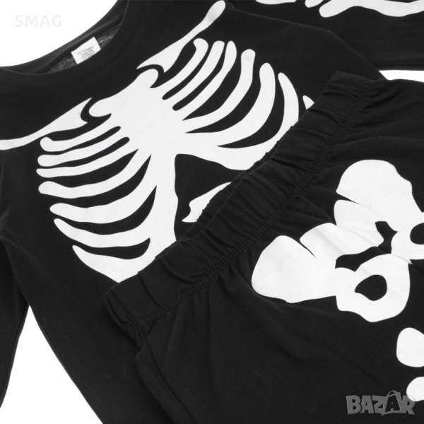 Комплект Halloween / Хелоуин пижама от памук с черна блуза и бял скелетен дизайн, комбинирана с черен панталон с бели скелетни мотиви и удобен ластик на талията. Идеална за празнични визии и комфорт у дома.