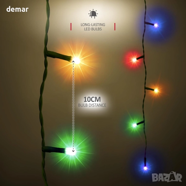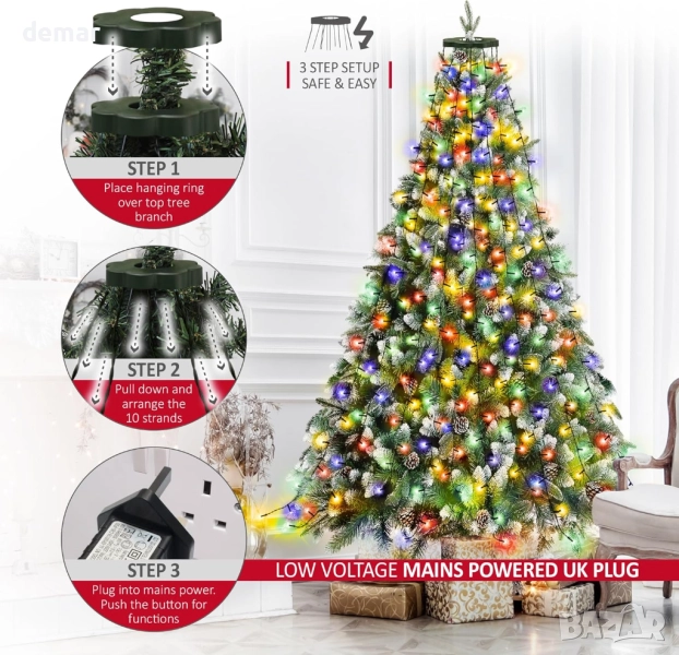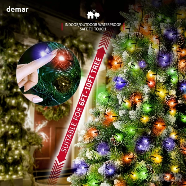 Тези лампички за елха се отличават с удобен пръстеновиден дизайн с 12 нишки от по 25 многоцветни светодиода всяка, предлагащи ярко и равномерно покритие за празничен вид. Вграденият таймер ги държи включени за 8 часа и изключени за 16 часа автоматично, докато функцията за памет запомня избраната от вас настройка измежду 8 режима на осветление, включително постоянно, затихващо, блясък и мигане. Подходящи както за вътрешна, така и за външна употреба, нисковолтовият щепсел със степен на защита IP44 осигурява безопасност и лесен монтаж с 5-метров кабел за гъвкаво разположение.