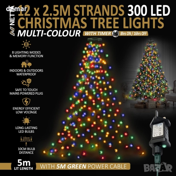 Коледни лампички за елха NETTA 2,5 м x 12 нишки 300 LED, 8 режима, многоцветни