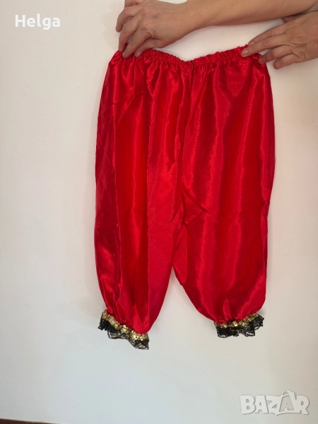 Длина на роклятя 110см. Червена рокля за спортни танци или като карнавален костюм за тематични вечери за училище. Роклята си има пера и е от велур. Заедно с роклята има и панталон(на снимката).