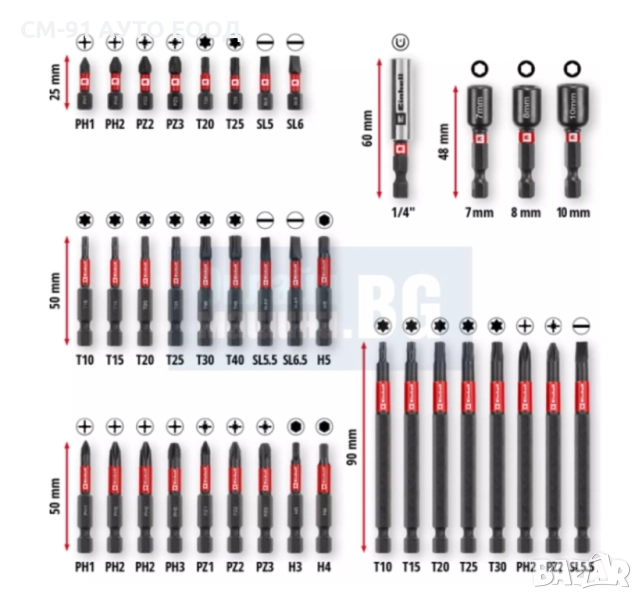 Комплект ударни удължени битове се състой от 38 части. Всички ударни накрайници са изработени от здрава, манган-фосфатирана стомана S2 и предлагат дълъг експлоатационен живот и издръжливост. Манган-фосфатизираното покритие осигурява защита от корозия и намалява триенето при проникване в материала на винта. Предлагат се в здрава кутия. Практичната кутия за съхранение е снабдена със здрава щипка с автоматично заключване, която гарантира, че кутията е здраво затворена.