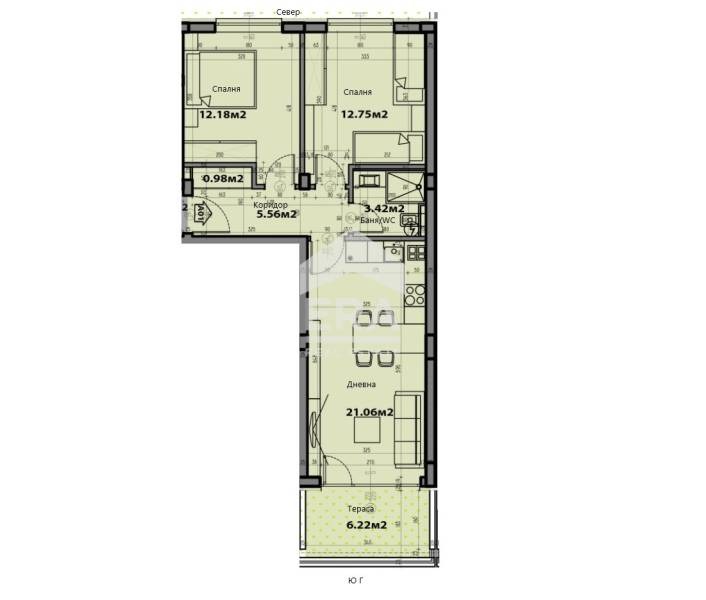 ЕРА Варна Тренд предлага за продажба тристаен апартамент със собствен двор, в новострояща се сграда в кв. Виница. Имотът е със застроена площ 66,04 кв.м (76,91 кв.м с общите части), както и прилежащ двор с площ 6,22 кв.м, разположен на първи партерен етаж от общо 4 етажа. Състои се от дневна с кухненски бокс (21,06 кв.м) и излаз на двор (6,22 кв.м), две спални (12,18 кв.м и 12,75 кв.м), коридор (5,56 кв.м), баня с тоалетна (3,42 кв.м) и килер/перално помещение (0,98 кв.м). Изложението е юг (дневна) - север (спални). Статутът е на апартамент.