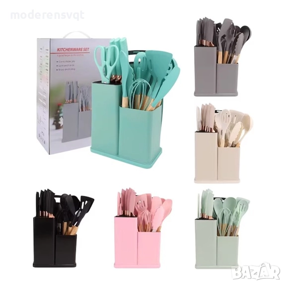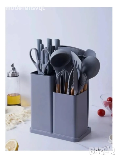 К-т силиконови прибори 33 части със стойка ножове, ножица и дъска