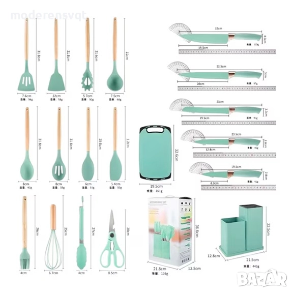 Включва основни прибори като шпатули, лопатки, четки за полиране, щипки, както и комплект перфектно остри ножове от неръждаема стомана. Всички те са организирани в компактна и естетична стойка, която заема малко място и предлага модерен вид на всяка кухня.