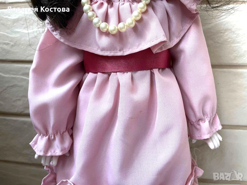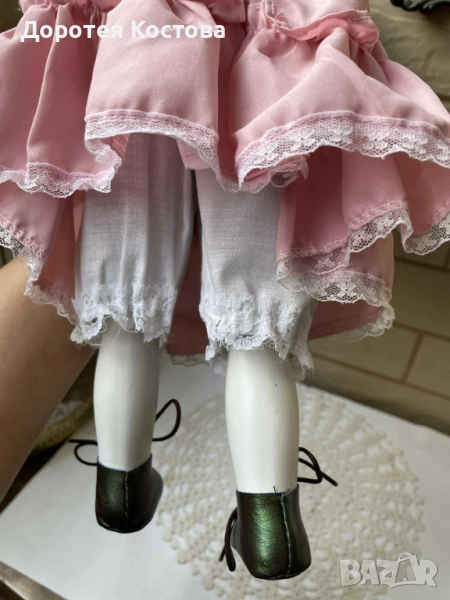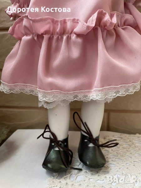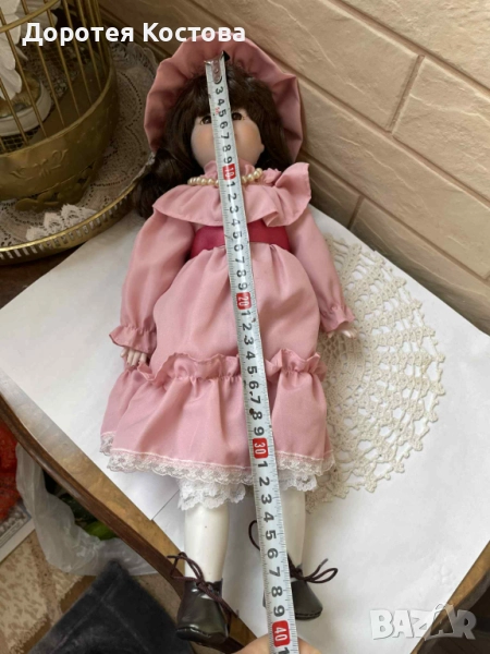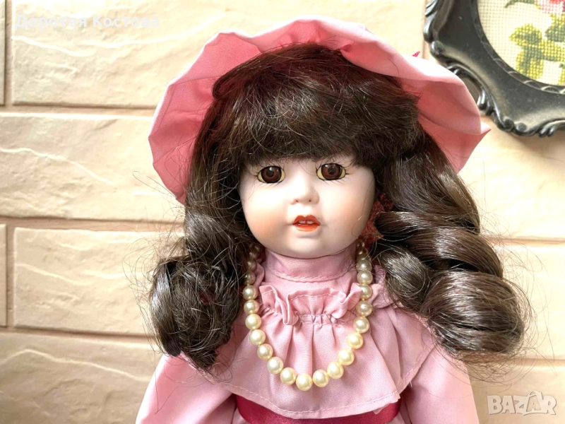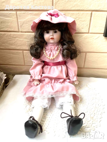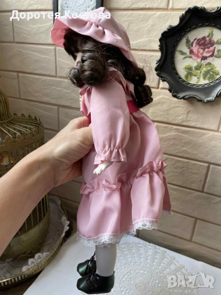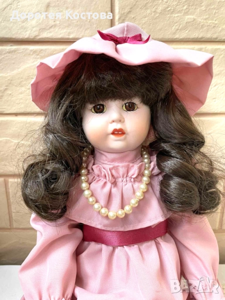 Красива порцеланова кукла от Англия с височина 40 см с маркировка и с розова рокля и шапка. Цена - 35 лв / 17.90 евро.