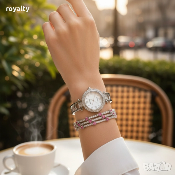 Каишка: Метална, сребрист цвят, с декоративни елементи и камъни;