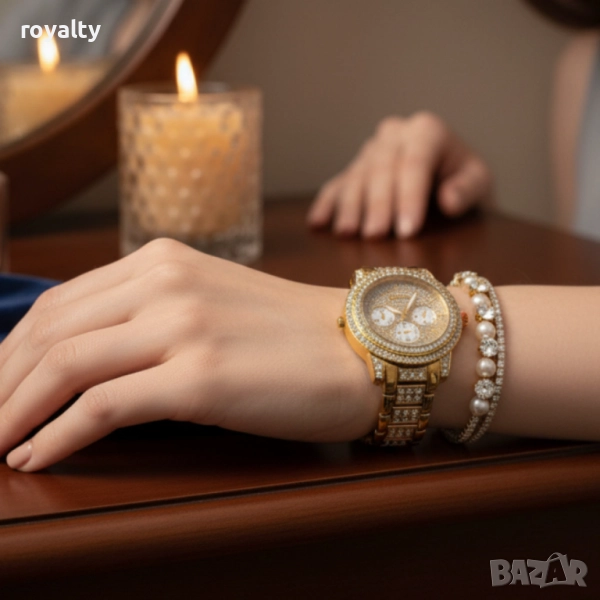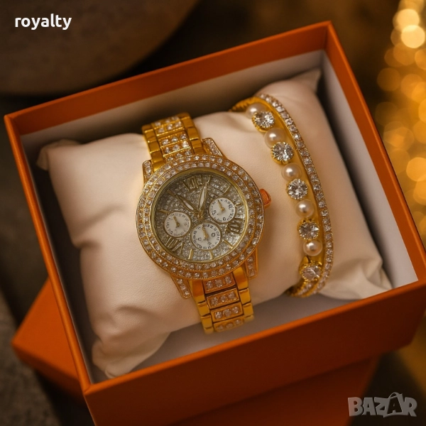 Продукт: Дамски комплект часовник + гривна, златист, с кристали, в подаръчна кутия;