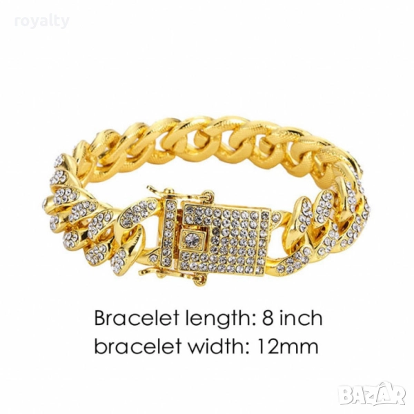 Гривна: Кубинска верига, ширина 12 мм, дължина ~20 см, инкрустирана с кристали;