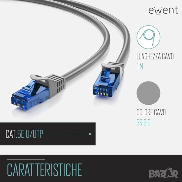 🌐 Ewent EW-5U-010 – Мрежов кабел Cat 5e U/UTP с RJ45 конектори, 1 м, Сив