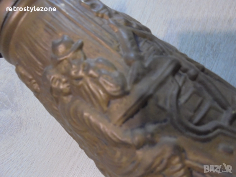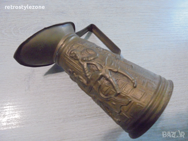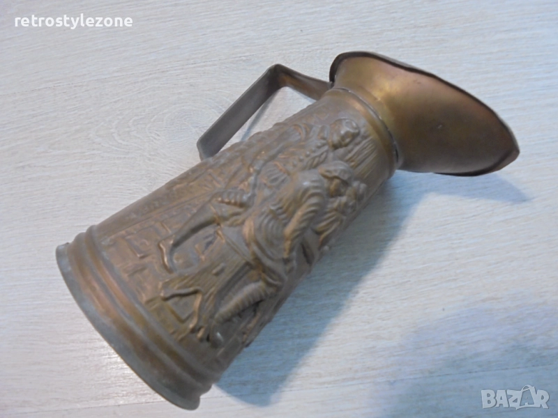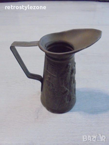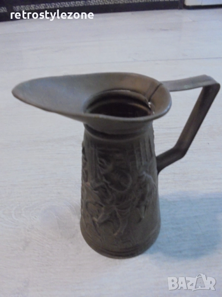 Стара красива ретро метална кана, изработена от ламарина с богата релефна украса. По корпуса са изобразени фигури и орнаменти в класически стил, придаващи ѝ старинен и автентичен вид.