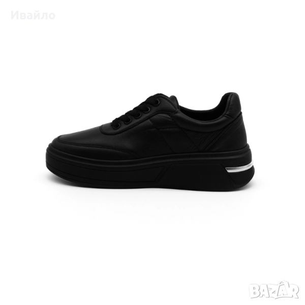 Тези стилни дамски спортни обувки в класически черен цвят са изработени от висококачествена естествена кожа, която гарантира дълготрайност, мекота и комфорт при всяко носене. Моделът е с минималистичен дизайн, подчертан от масивна подметка с лека платформа, която осигурява стабилност и съвременно излъчване.