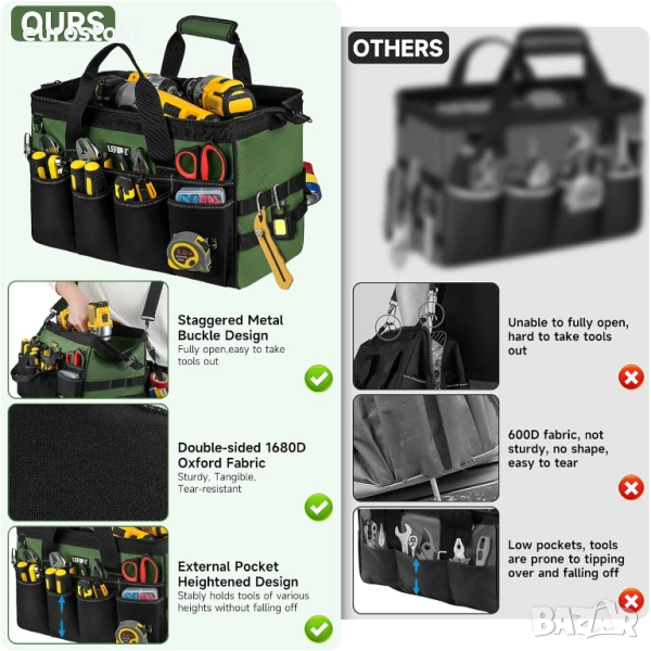 За разлика от обикновените платнени чанти за инструменти, тази чанта за инструменти е изработена от по-здрава, здрава материя 1680D, която е устойчива на надраскване, износване и разкъсване. Подсилените шевове и здравата метална катарама я правят подходяща за различни работни среди и издържа на дългосрочна употреба