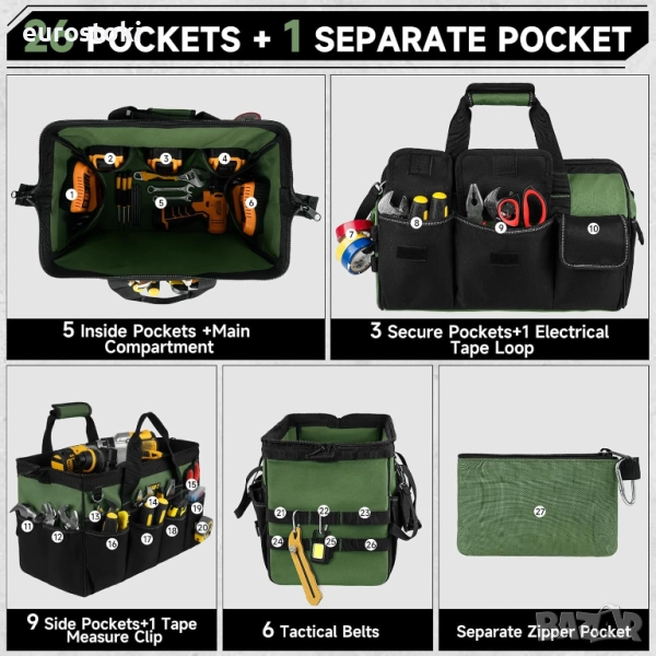 27 джоба Голям капацитет: 41 см Д x 21,7 см Ш x 29,5 см В; Тази кутия за инструменти е проектирана с 1 голямо вътрешно отделение, 5 вътрешни джоба, 12 външни джоба, 6 тактически колана, 1 примка за изолирбанд, 1 щипка за ролетка и 1 подвижен джоб с цип, специално предназначен за винтове.