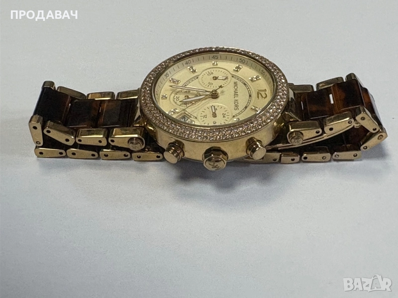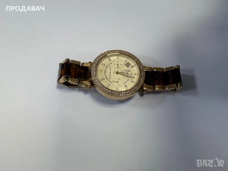 Michael KORS MK5659 . Оригинален дамски стилен часовник , изключително запазен , златисто-кафява метална верижка. Има нежни камъчета по кръглия корпус . Работи . Изпращаме с преглед и тест .