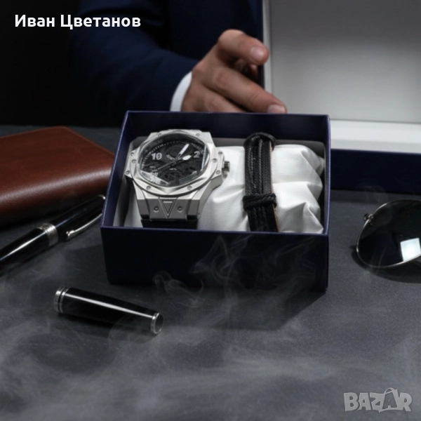 Тип: Мъжки комплект аксесоари за китка – аналогов часовник + декоративна гривна;
