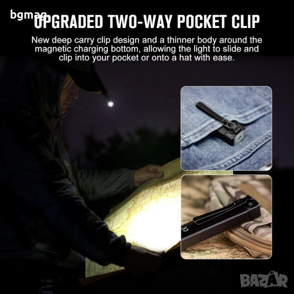 - ✅ ЛЕСЕН ЗА ИЗПОЛЗВАНЕ - Уникална плоска форма, ултратънък корпус, неплъзгаща се текстура от двете страни на фенерчето. С двупосочна джобна щипка, Arkfeld UV може да бъде здраво закрепен към шапки, ризи или джобове.