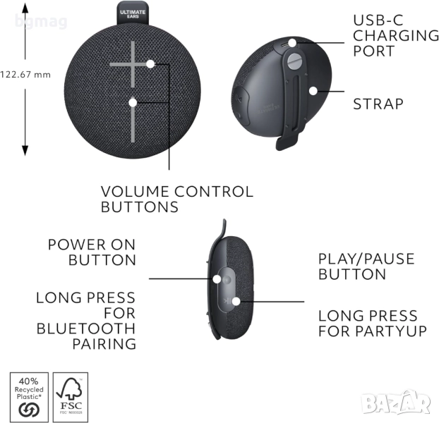 - ✅ Изработен от рециклирана пластмаса: Пластмасовите части в мини високоговорителя MINIROLL съдържат минимум 40% рециклирана пластмаса по тегло