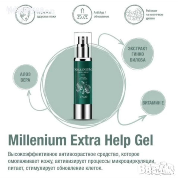 Millenium extra help Gel е високоефективен продукт против стареене, който подмладява кожата, активира процесите на микроциркулация, подхранва и стимулира обновяването на клетките. Благодарение на високата бионаличност, активните компоненти на гела проникват в дълбоките слоеве на кожата, овлажняват я на всички нива, стимулират производството на собствен „млад“ колаген и еластин, възстановявайки плътността, гладкостта, нежността и еластичността на кожата.. Гелът подобрява тонуса и еластичността на кожата, изглажда бръчките и ”пачия крак”, придава на лицето ясни контури.