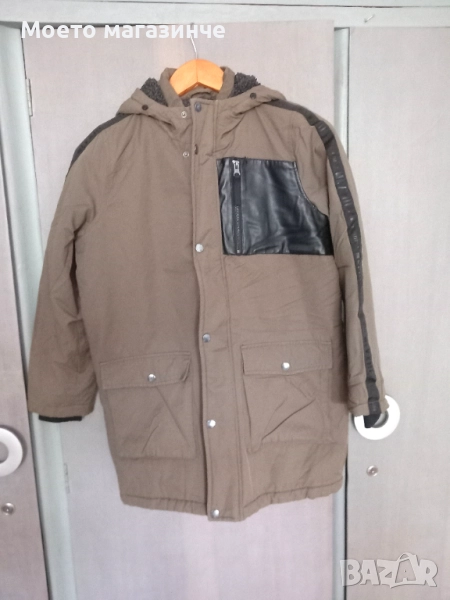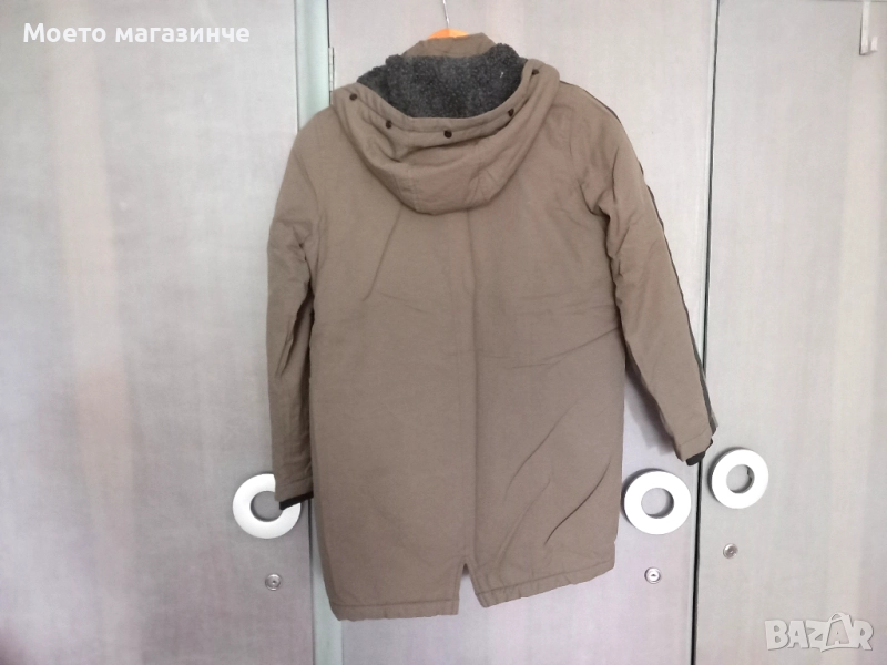 Много топло, стилно и удобно дълго зимно яке в кафяво-каменен цвят, с интересни детайли от еко кожа. Отвътре е с плътна подплата тип „агнешка кожа“ – мека и много топла. Има практична качулка и големи джобове с капаци.