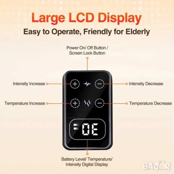 Масажорът за стави има чувствителни на допир бутони и голям LCD дисплей, което го прави лесен за работа, дори за възрастни потребители.