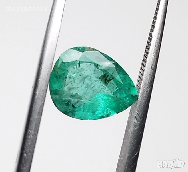 минимални видими включения. Цвета е зелен, равномерно разположен. Форма капка с