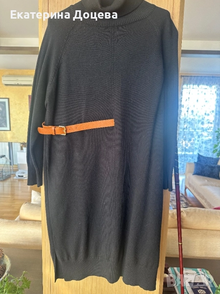 Рокля с поло яка и кожен аксесоар в кафяво, тип колан. Свободен силует, топла и практична.