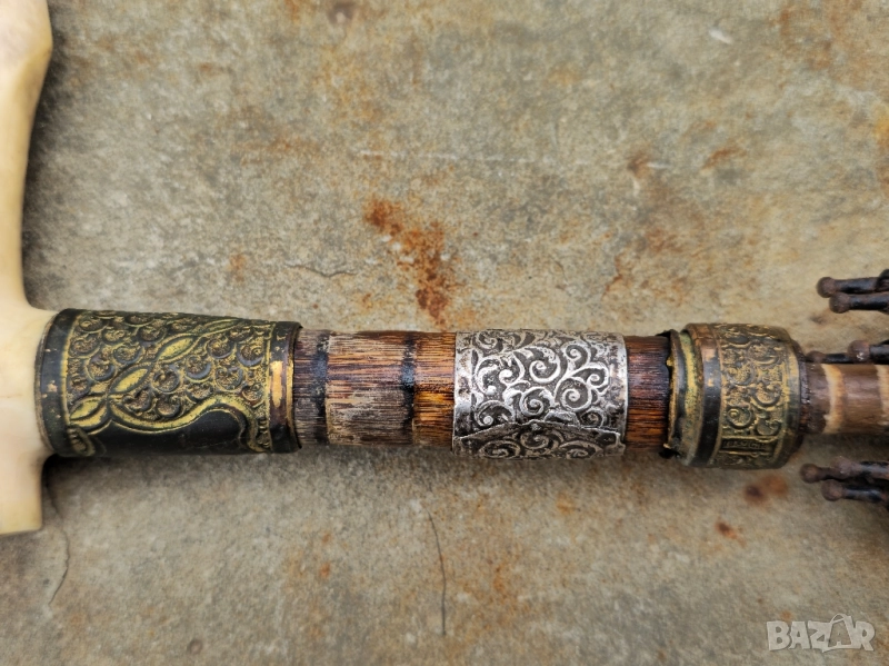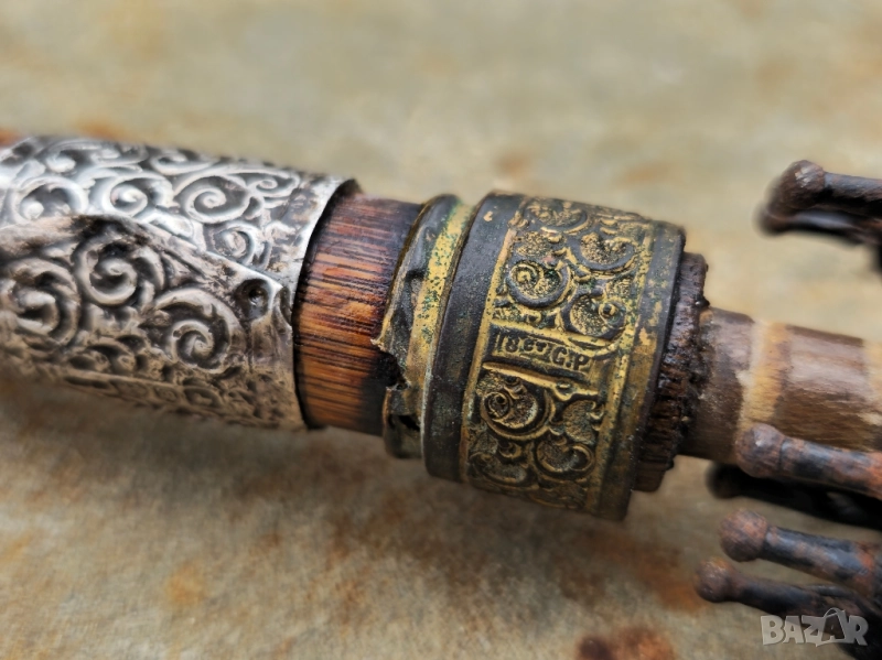 Покрай дръжката има богата украса от цветни метали позлата и Сребро със налични маркировки и печати.