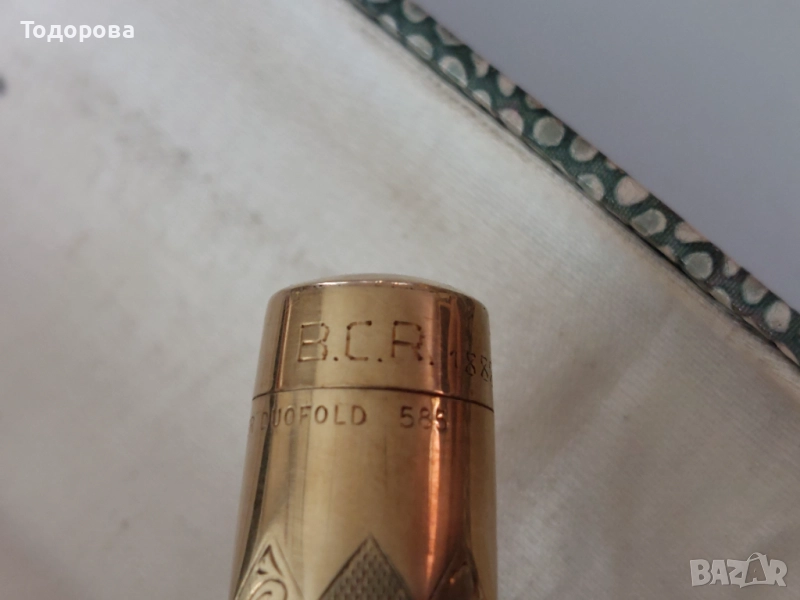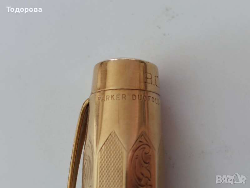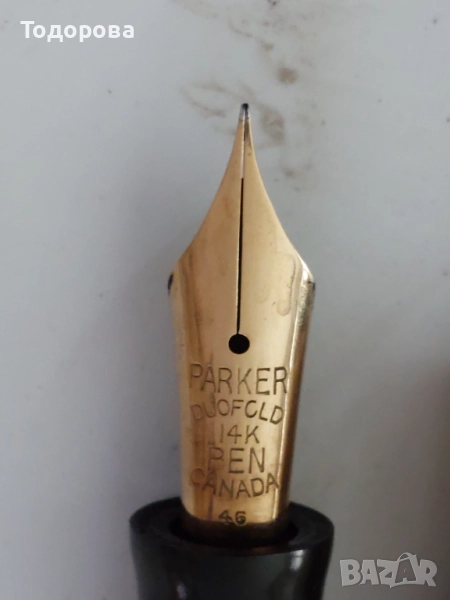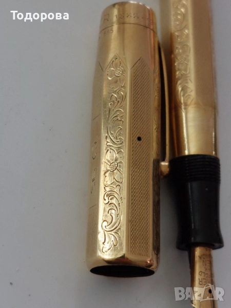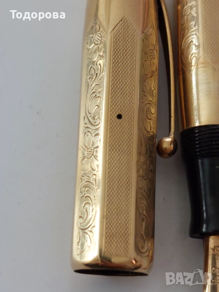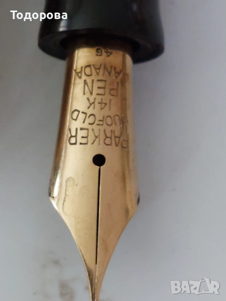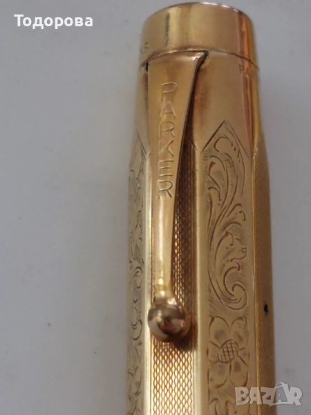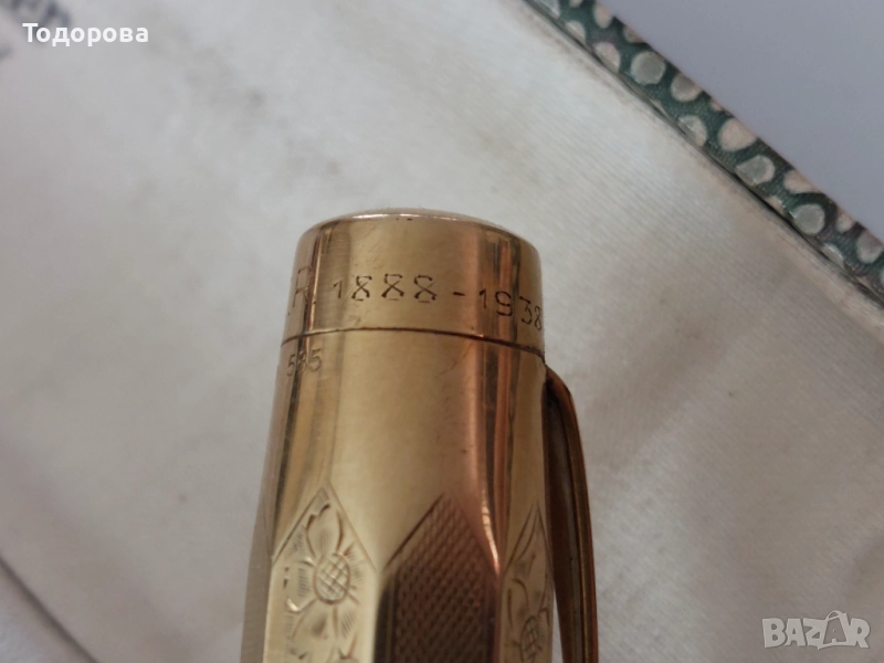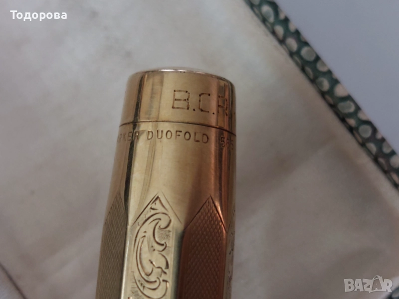 Показвам тази доста рядка писалка произведена в първата половина на миналия век.Модел Parker,изработена от солидно четиринадесет каратово злато''възможно писалката да е правена по поръчка.Защото е видно ,че е подарена на човек по случай неговата петдесет годишнина.Профилактирана е преди две години от най добрия майстор на писалки в България.Също след профилактиката не е използвана,седи си в кутийката.Подходяща е както за подарък така и за инвестиция,а също и може да си я ползвате и да подписвате сериозни договори и документи със тази наистина изящна и рядка вещ.Предварително благодаря на всички които ще посетят и прочетат обявата ми!