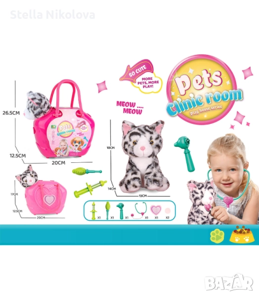 Малко плюшено кученце иликотенце със сладка муцунка, в което ще се влюбите от пръв поглед! То идва с кокетна розова чанта и различни докторски принадлежности. Комплектът е страхотен подарък за всяко дете, обичащо животните!