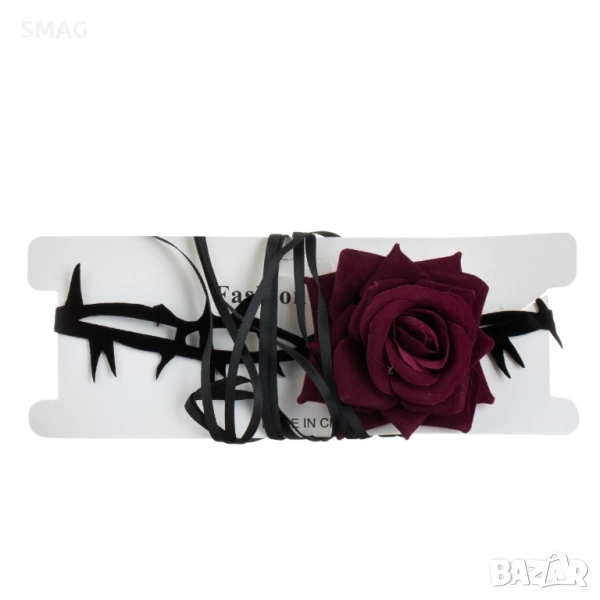 Готически карнавален чокър с черна сатенена лента, кадифени бодли и бордо роза – перфектен завършек за мистериозна и елегантна визия. Подходящ за Halloween / Хелоуин, карнавали и тематични партита. Подчертава шията и придава изтънчен, драматичен ефект.