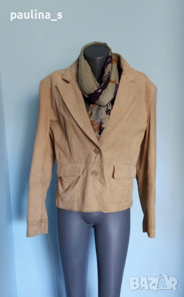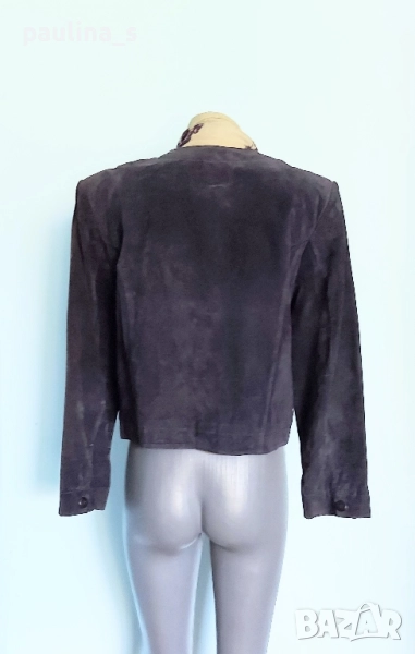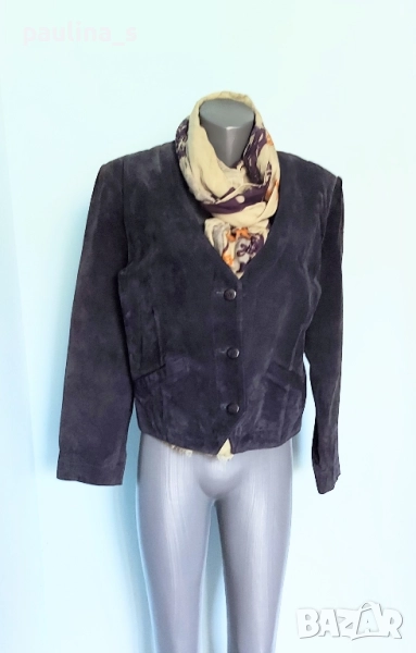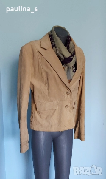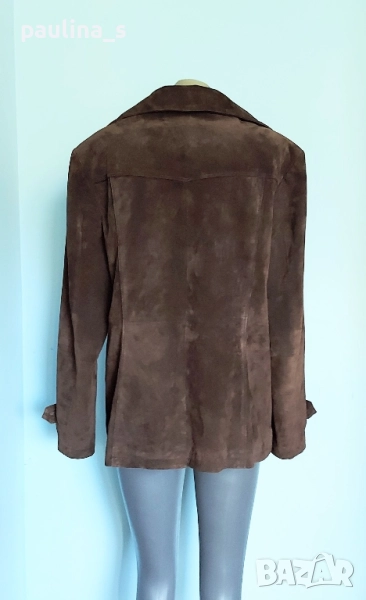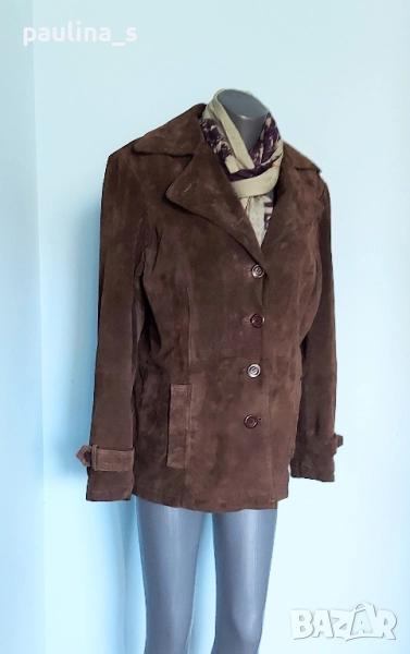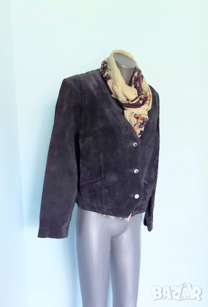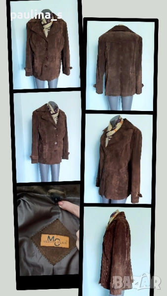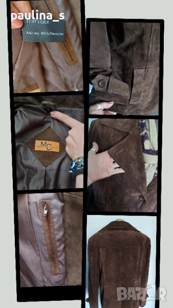 3️⃣. Колаж / L / 2XL - "Marcel Clair". Цената е крайна 49,99лв / 25 евро. Цената е крайна 49,99лв. Дизайнерски блейзър от естествен велур с красива яка, винаги актуално и маншети с копчета. Моделът е обран, леко втален, а джобовете са вертикални. Цветът е Шоколад. Дрехата е с подплата и хастар и става за по-хладно време като палто. Има вътрешен джоб с цип и цепка отзад. Без дефекти по кожата и хастара.