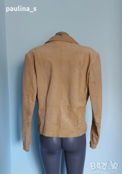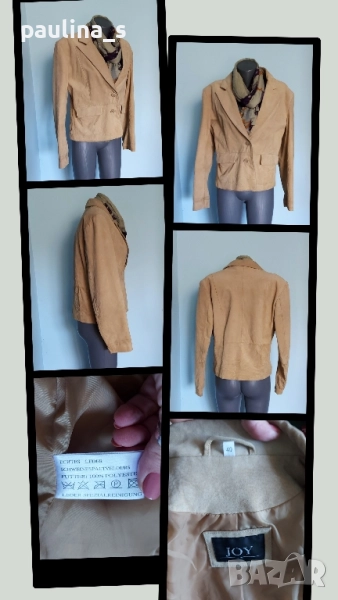 2️⃣. Колаж / L / 2XL - "Joy". Цената е крайна 29,99лв / 15 евро. Дамско сако или яке от естествен велур в цвят Охра - жълтеникав. Моделът е с ревери, къс и втален, дрехата е голям размер и е снимана на малък размер манекен. Нуждае се от почистване, иначе няма дефекти по кожата и хастара, съобразена цена!