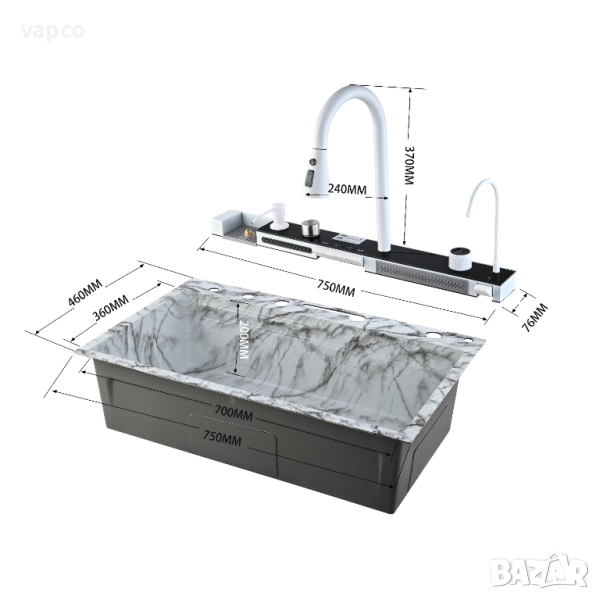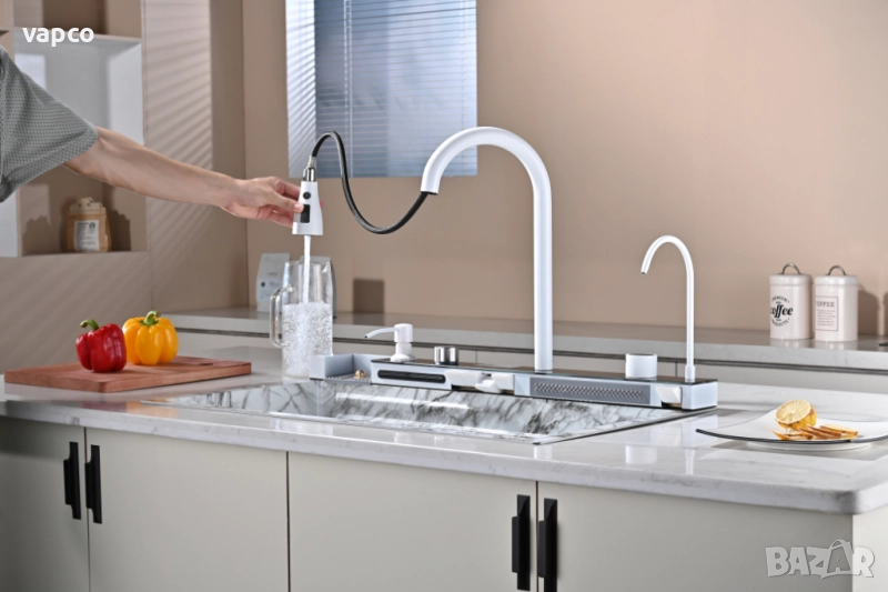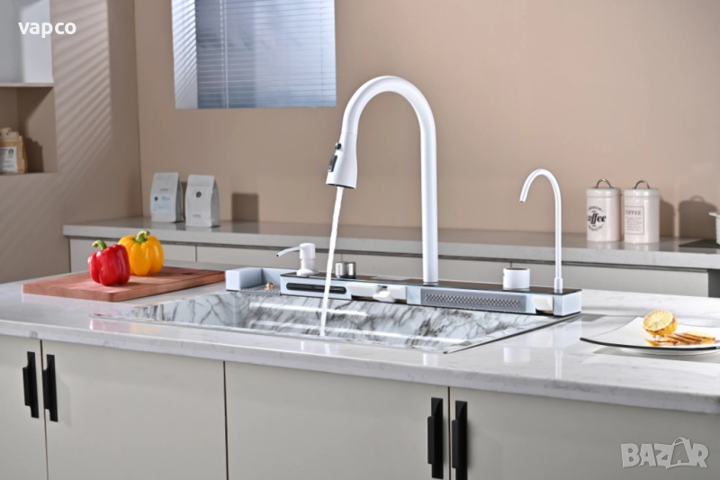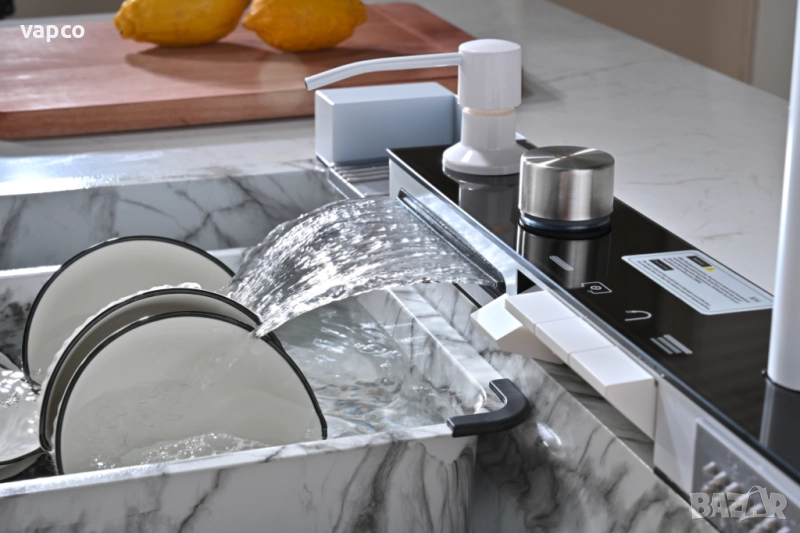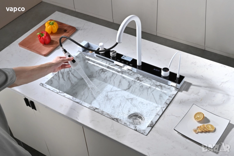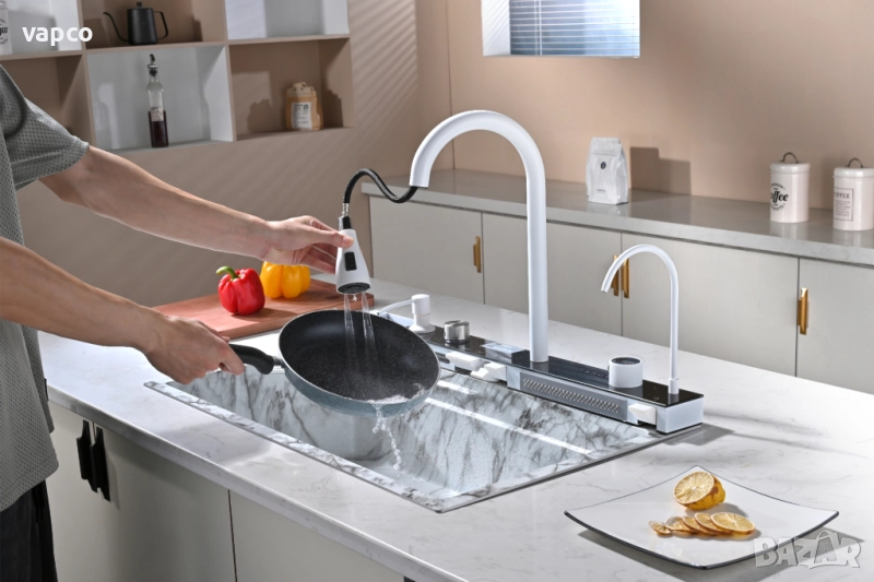 Бял мрамор - Мултифункционална кухненска мивка с двоен водопад