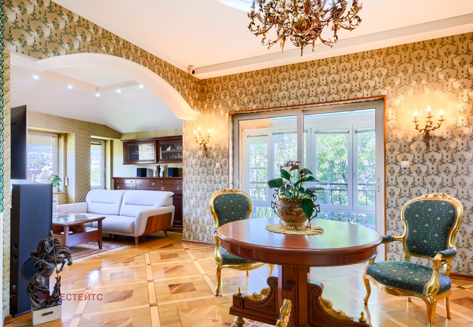 Второ ниво: 2 спални (едната 27 кв.м.), дрешник, 2 бани, 2 тераси. Имотът се продава без част от антикварните мебели.