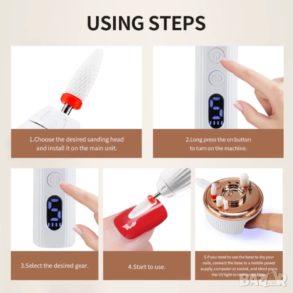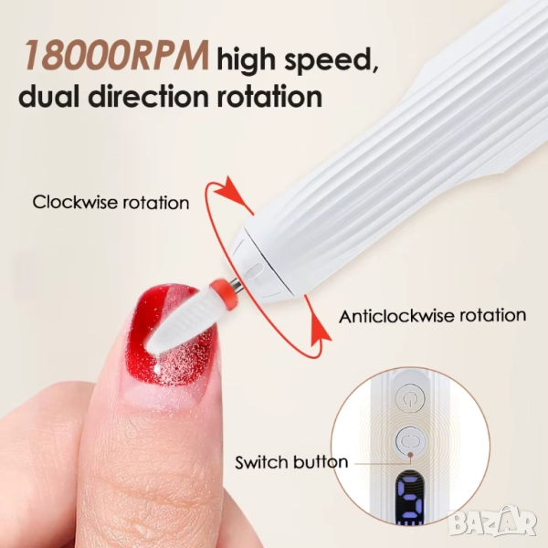 Нискошумен и мощен мотор, висока скорост от 18000 об/мин, двупосочно въртене (по посока на часовниковата стрелка/обратно на часовниковата стрелка), 5-степенно регулиране на интензивността, професионален ремонт на ноктите без повреда на ноктите, оставяйки ноктите ви гладки и плоски.