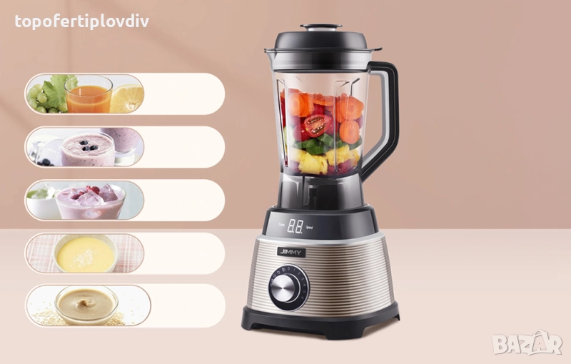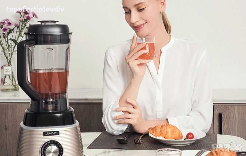 Край на неапетитните, непаснати парчета храна във вашите коктейли. Блендерът марка JIMMY разполага с мощност до 1000 W и скорости до 25 000 оборота в минута. Той се отличава и с подобрения си, внимателно обмислен дизайн и четворно острие, така че всички съставки да могат да бъдат пасирани перфектно и равномерно. Уредът дори се справя с парчета лед с лекота! Освен това извлича повече хранителни вещества. Всичко това прави приготвянето на гладки, вкусни и здравословни смутита, пюрета и други.
