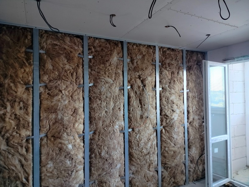 - На всички стени и тавани ще бъде монтиран гипсокартон и е сложена вата за допълнителна шумо и топлоизолация, а в санитарните помещения ще бъде монтиран влагоустойчив гипсокартон.